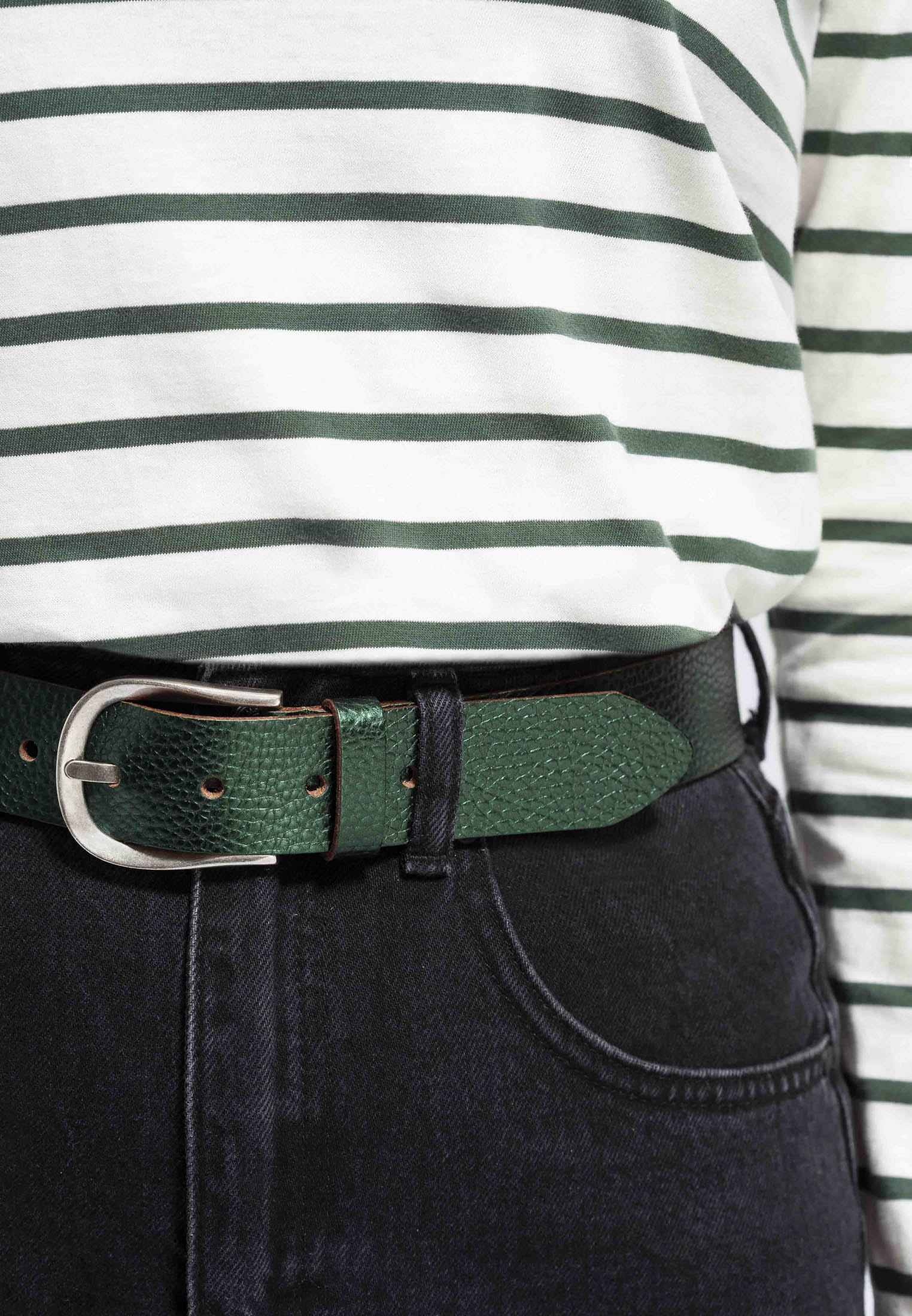 Der Gürtel ist 35 mm breit und mit einer schlichten Dornschließe in mattem Silber verziert. Dieser Gürtel ist die ideale Ergänzung zu allen Freizeit-Outfits und garantiert einen aufsehenerregenden und modernen Look.