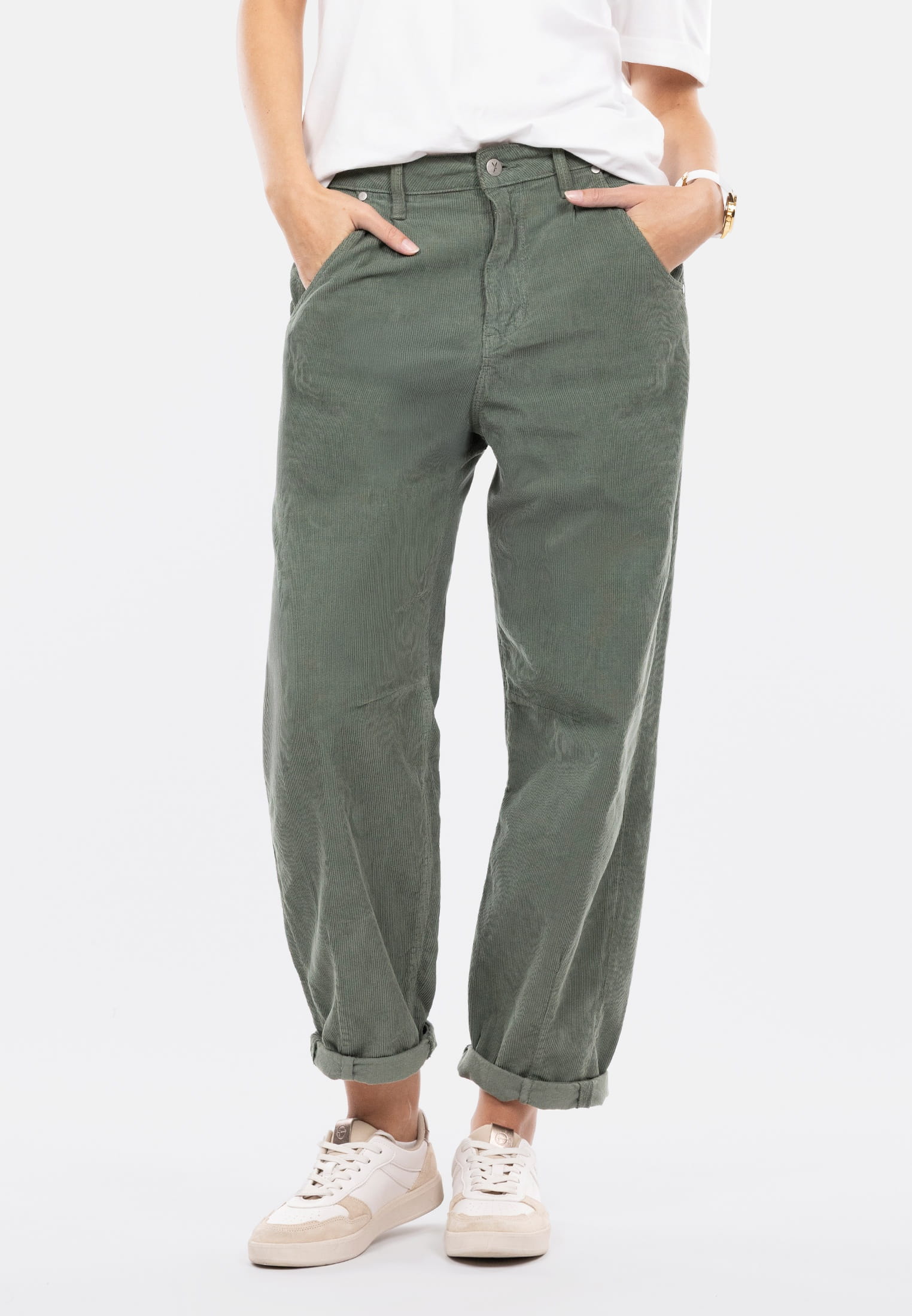 Besondere Design-Details wie die tief gerundeten Fronttaschen, gekrempelte Beinabschlüsse und klassische Gesäßtaschen unterstreichen den entspannten Charakter der Hose. Ob mit Sneakern und Strick für den Alltag oder mit Bluse und Boots für einen stylischen Kontrast - diese Hose lässt sich vielseitig kombinieren.