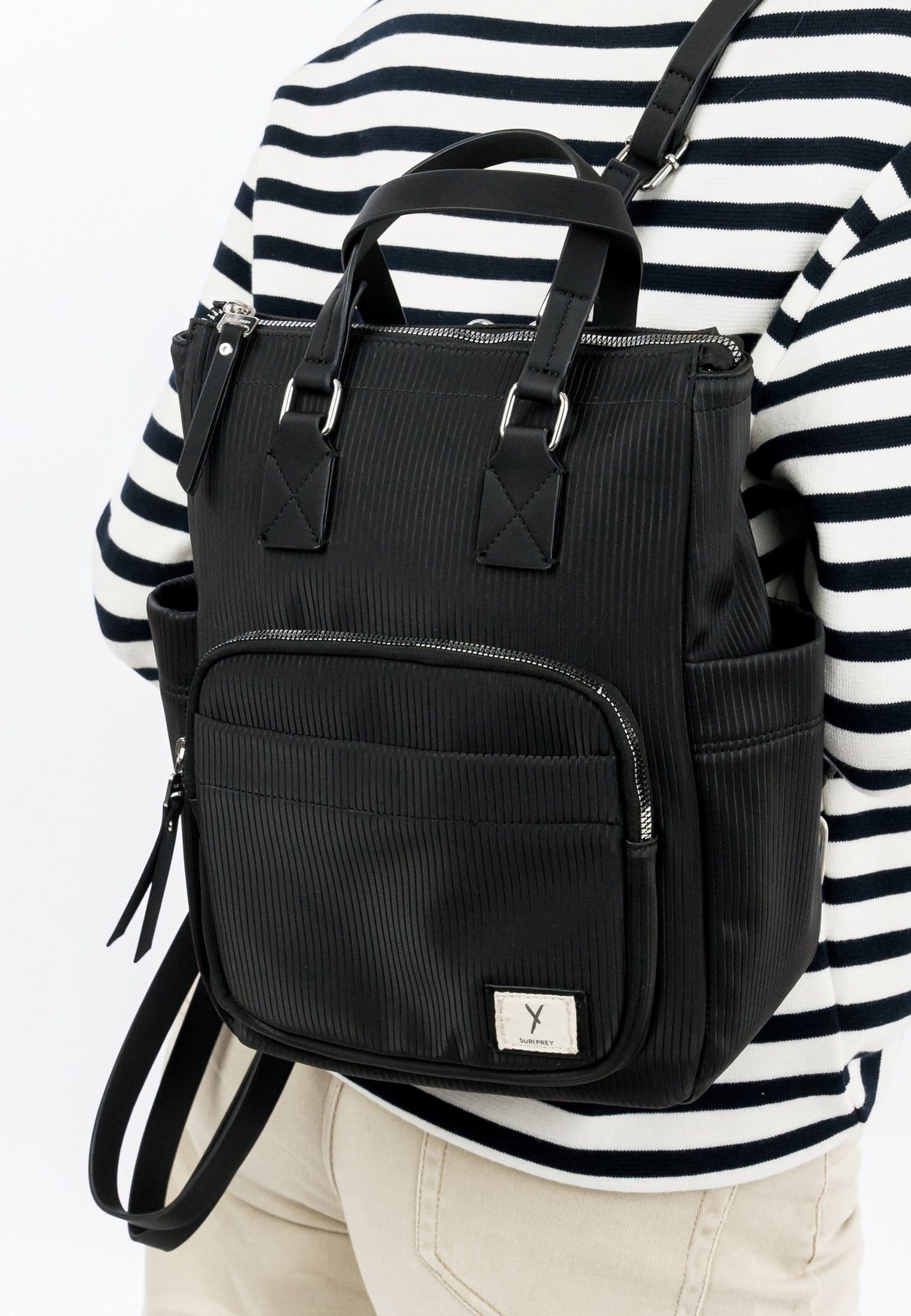 Wenn wir unterwegs sind, wollen wir uns rundum wohlfühlen. Wir bei SURI FREY haben genau die Accessoires, die unsere Kundinnen so glücklich machen. Unser Rucksack hat übersichtliche Hauptfächer. Das Rückfach mit Reißverschluss verschafft Dir zusätzlich Platz und gewährleistet jederzeit ein schnelles Zugreifen auf Deine Habseligkeiten. Das Modell SFY Ricky ist von der Haptik eher weich und daher wirklich angenehm zu tragen. Für das besondere Extra sorgt die Applikation mit dem Logo-Patch, die direkt ins Auge fällt. Mit einem angenehmen, verstellbaren und abnehmbaren Rückenriemen und den zwei Tragegriffen wird der neue Lieblingsbegleiter ganz locker und entspannt auf dem Rücken getragen. So lässt sich der Schaufensterbummel oder die Verabredung zum Kaffee so richtig genießen: Der mittelgroße Rucksack bietet ausreichend Platz für all die Dinge, die Du im Alltag brauchst.