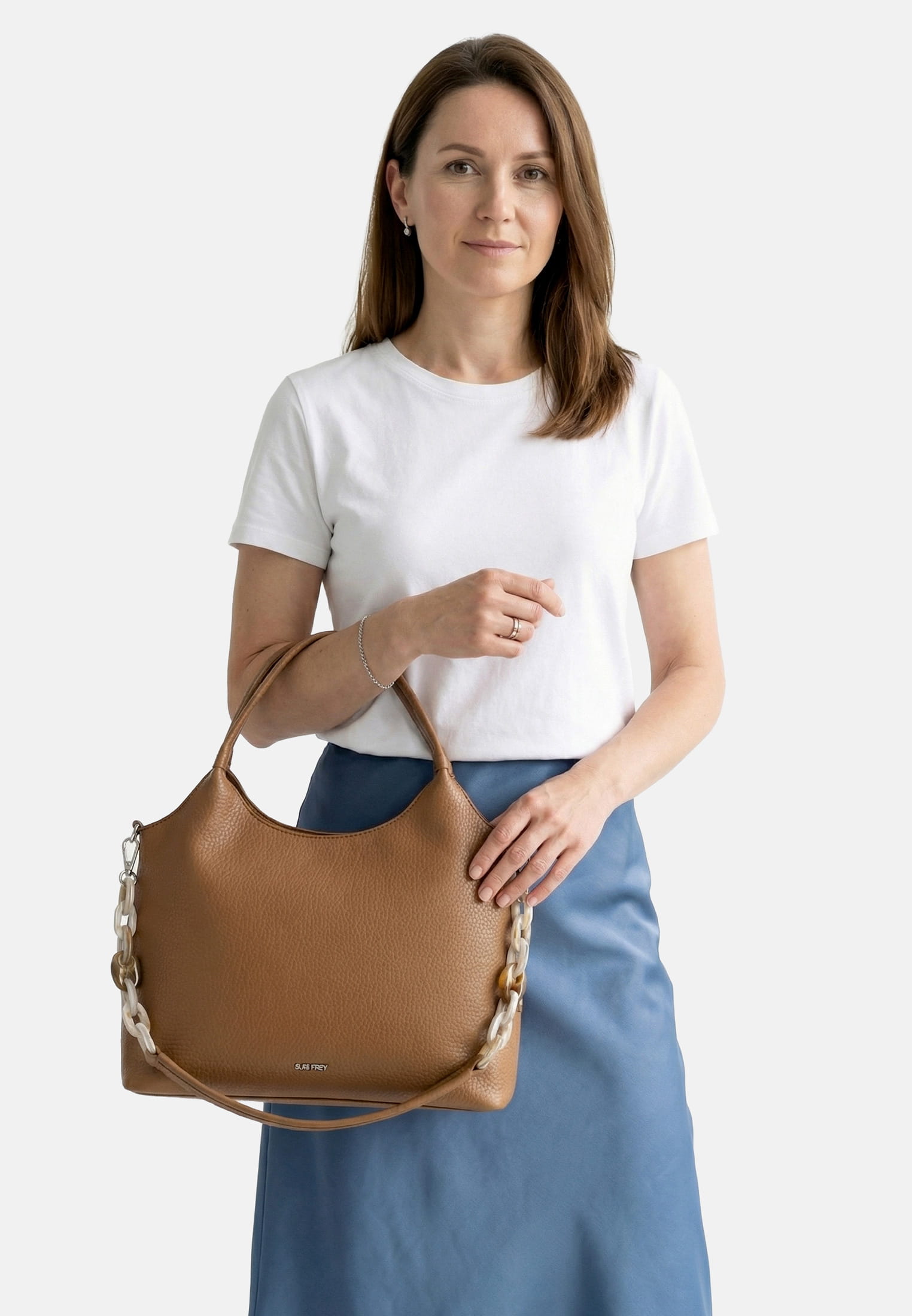 Unsere stylischen Accessoires von SURI FREY stehen für Lebenslust, Freiheit und Offenheit - genau das, was Frauen mit Selbstbewusstsein ausmacht. Einfach und praktisch: Übersichtliche Hauptfächer hat der Shopper. Ein Rückfach mit Reißverschluss bietet zusätzlichen Stauraum und erlaubt den schnellen Zugang zu Dingen, die man immer zur Hand haben möchte. Durch die weiche Haptik schmiegt sich Dein neuer Shopper der Serie SFY Jeanny angenehm an. Einen besonderen Akzent setzen die Ketten. Mit den zwei Tragegriffen wird das neue Lieblingsstück ganz entspannt über der Schulter getragen. Dank der verschiedenen Tragevarianten ist dieses Modell so wandelbar wie Dein Alltag und fügt sich perfekt in jede Situation ein. Ob der übliche Plunder, der einfach in einen Shopper gehört, oder die Einkäufe - ausreichend Platz bietet das große Modell in jedem Fall.